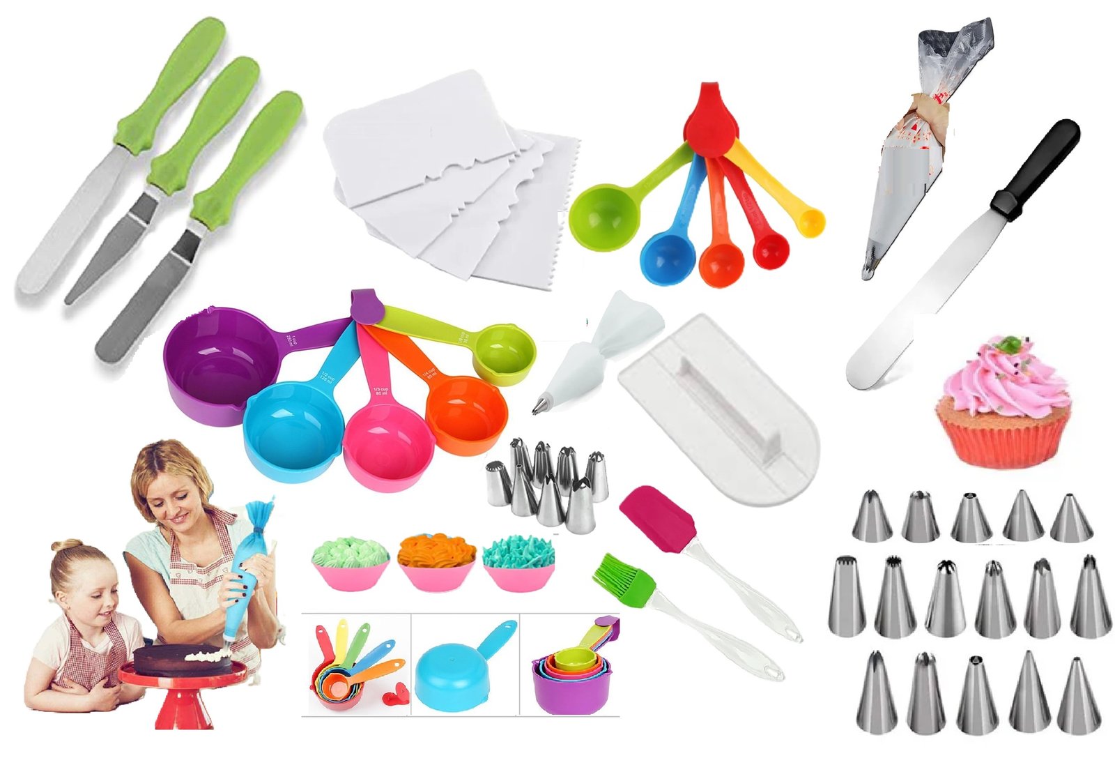 ack included – 3 units stainless steel cake decorating ganache knife , 1 unit pallet knife, 5 unit measuring spoons, 5 unit measuring cups, 1 smoother, 4 units scraper tools, 12 units mixed design nozzles , 1 nit silicone brush , 1 unit silicon spatula, 68pcs icing bags